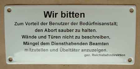 kleines Emailleschild, gewölbt, dick emailliert, 12 x 4 cm, "Zum Vorteil der Beutzer der Bedürfnisanstalt, den Abort sauber zu haben, Wände und Türen nicht zu beschreiben, Mängel den Diensthabenden Beamten mitzuteilen und Übeltäter anzuzeigen, gez. Reichsbahndirektion " Zustand 0 EURO 30,- inklusive Versand |