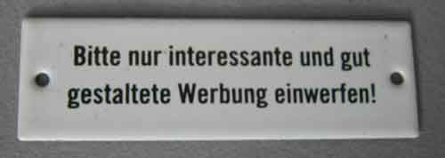 Bitte keine Werbung einwerfen kleines, schmales Emailschild, gewölbt, 20 x 3 cm Zustand 0 EURO 30,- |