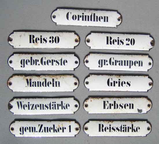 11 kleine Emailschildchen, gewölbt, ideal für Schubladenschränke Zustand 2 zusammen 95 Euro |