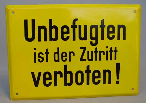 Unbefugten ist der Eintritt nicht gestattet kleines Emailleschild, gewölbt, dick emailliert, 12 x 4 cm, " " Zustand 0 EURO 20,- inklusive Versand |